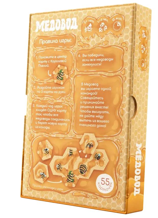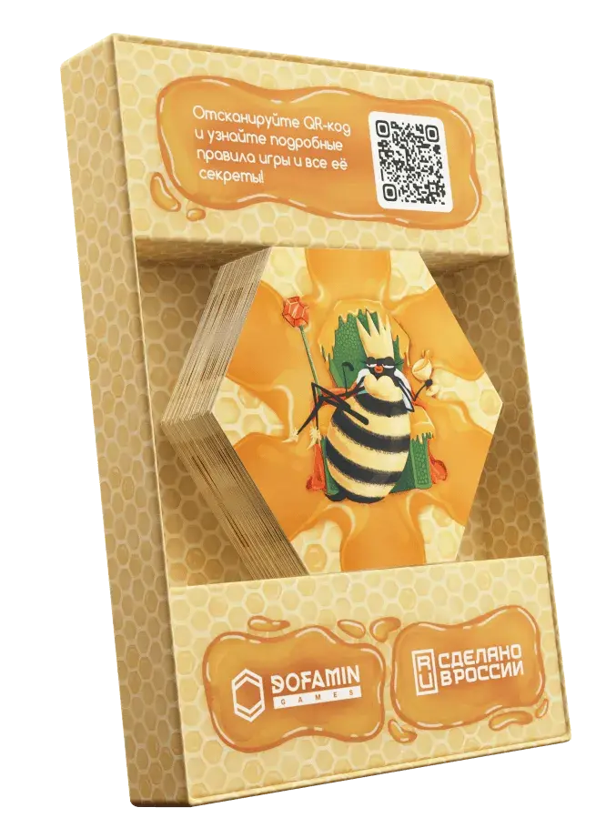 Это игра на победителя, поэтому играть в нее нужно минимум вдвоем! Каждый игрок становится пчеловодом, цель которого собрать как можно больше карточек с трудолюбивыми пчёлами в своей части Медовода. А карточки с ленивыми пчёлами по возможности оставить противникам.